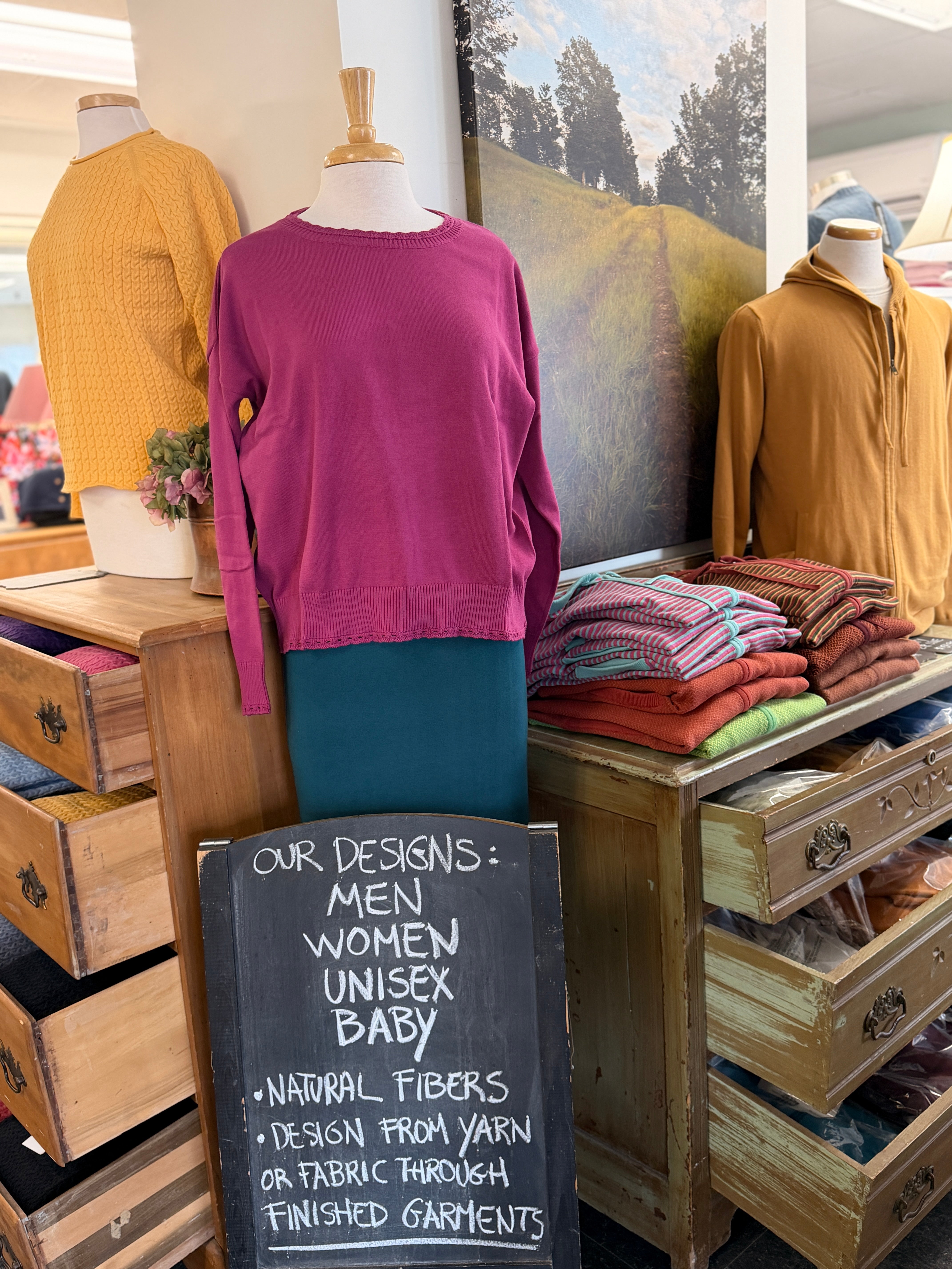 We practice slow fashion in small batches to provide you with long lasting timeless designs that are sustainably made with natural fibers.